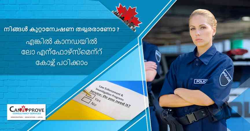 കാനഡയിലെ ഉന്നതപഠന സ്ഥാപനങ്ങളിൽ വിദേശവിദ്യാർത്ഥികൾക്ക് തെരഞ്ഞെടുക്കാൻ വ്യത്യസ്തപഠനമേഖലകളിലായി വിവിധ കോഴ്സുകൾ ഉണ്ട്. നിയമപാലനവും കുറ്റാന്വേഷണവും പഠിക്കാൻ മികച്ച അവസരങ്ങളാണ് കാനഡയിൽ ഉള്ളത്. ഈ കോഴ്സുകളിലേക്കുള്ള പ്രവേശനം ആരംഭിച്ചുകഴിഞ്ഞു. ഈ രംഗത്ത് വൈദഗ്ധ്യം നേടാൻ താൽപ്പര്യം ഉണ്ടെങ്കിൽ കാനപ്പ്രൂവ് വഴി അപേക്ഷിക്കൂ. നിങ്ങൾക്കുവേണ്ട എല്ലാ സഹായവും നൽകാൻ ഞങ്ങൾ സദാ സന്നദ്ധരാണ്.